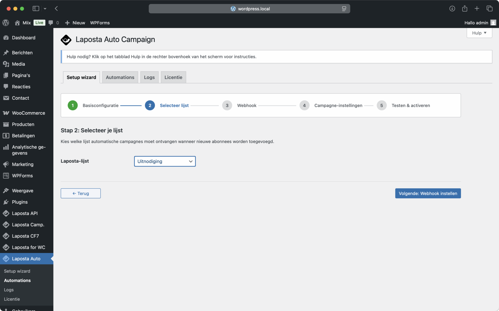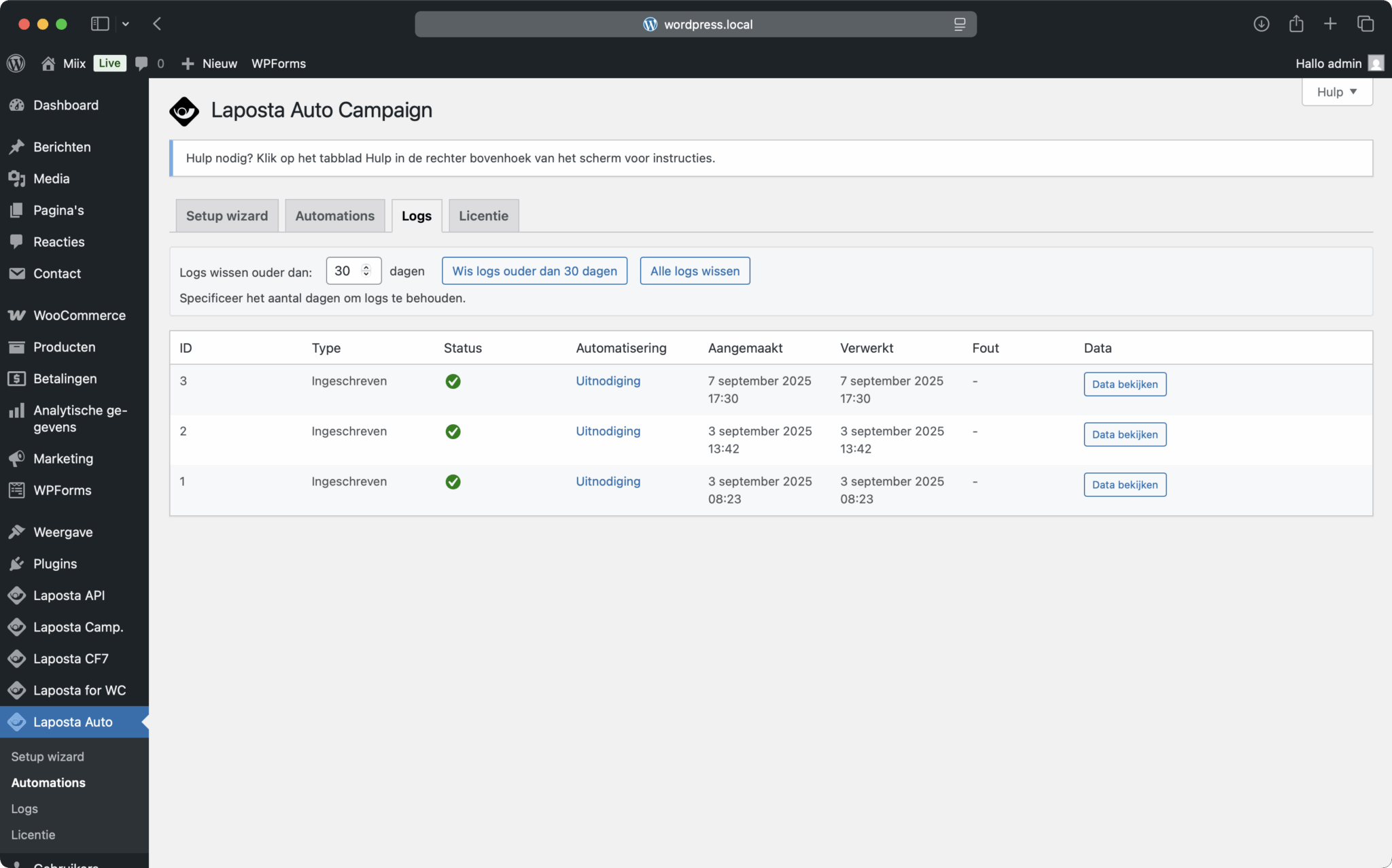 - Webhook logboek, inclusief Laposta webhook data